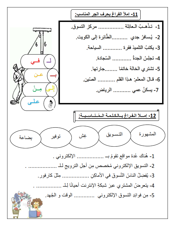 أوراق عمل التسوق لغير الناطقين بها للصف السابع في اللغة العربية