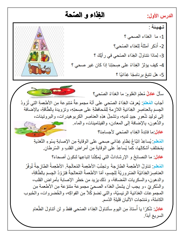 أوراق عمل الغذاء والصحة في اللغة العربية لغير الناطقين بها للصف السادس الفصل الثالث 2020 مذكرة دوت كوم