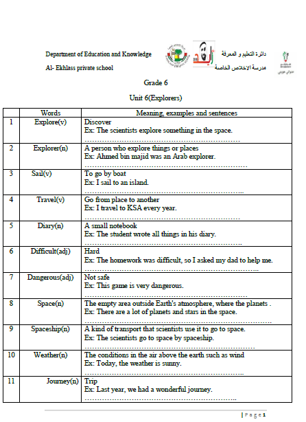اوراق عمل Unit 6 Explorers للصف السادس لغة انجليزية الفصل الثاني