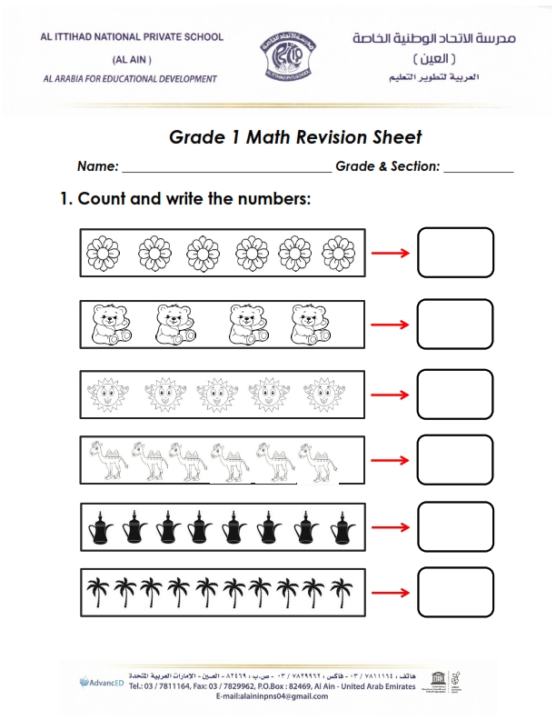 اوراق عمل بالانجليزي في الرياضيات المتكاملة للصف الاول الفصل الاول