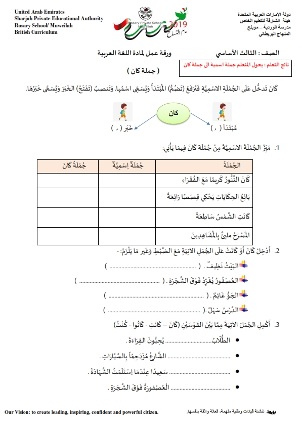 ورقة عمل عن جملة كان الصف الثالث لغة عربية الفصل الثالث المناهج الإماراتية
